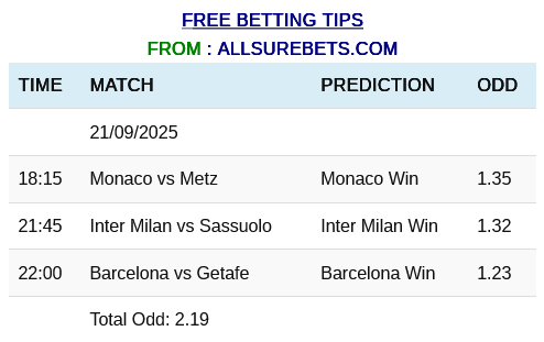 Free Betting Accumulator [ Odd: 2.19 ] – 21/09/2025